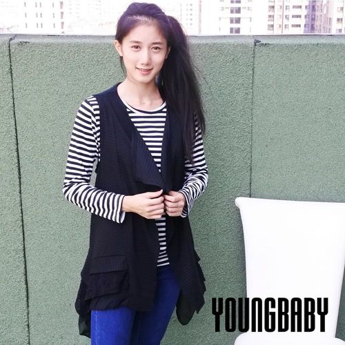 【YOUNGBABY中大碼】自然垂領下擺雪紡花蕾絲長版坑條背心